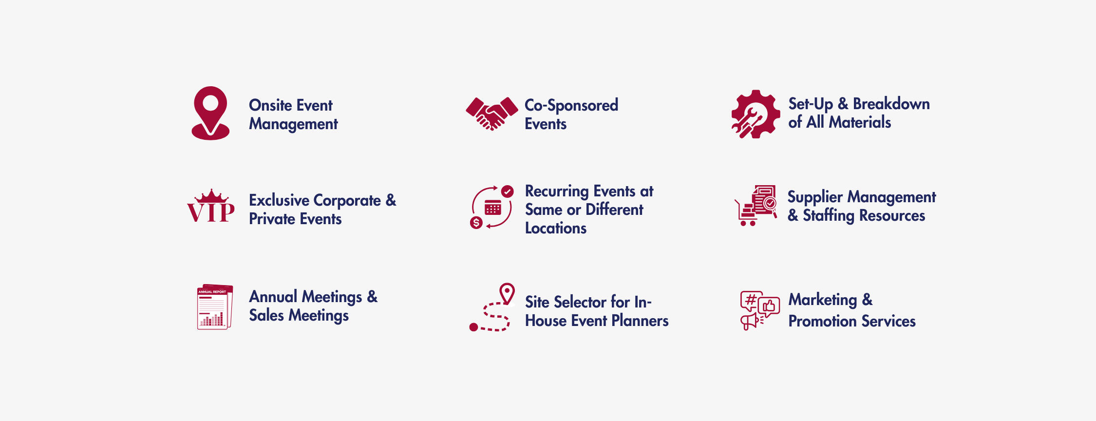 By delivering comprehensive, turnkey solutions for our clients at their facilities, we have been tasked to take on additional responsibilities such as planning and executing events to generate additional revenue at facilities. From there, we have grown our event management practice to include a variety of specialties.